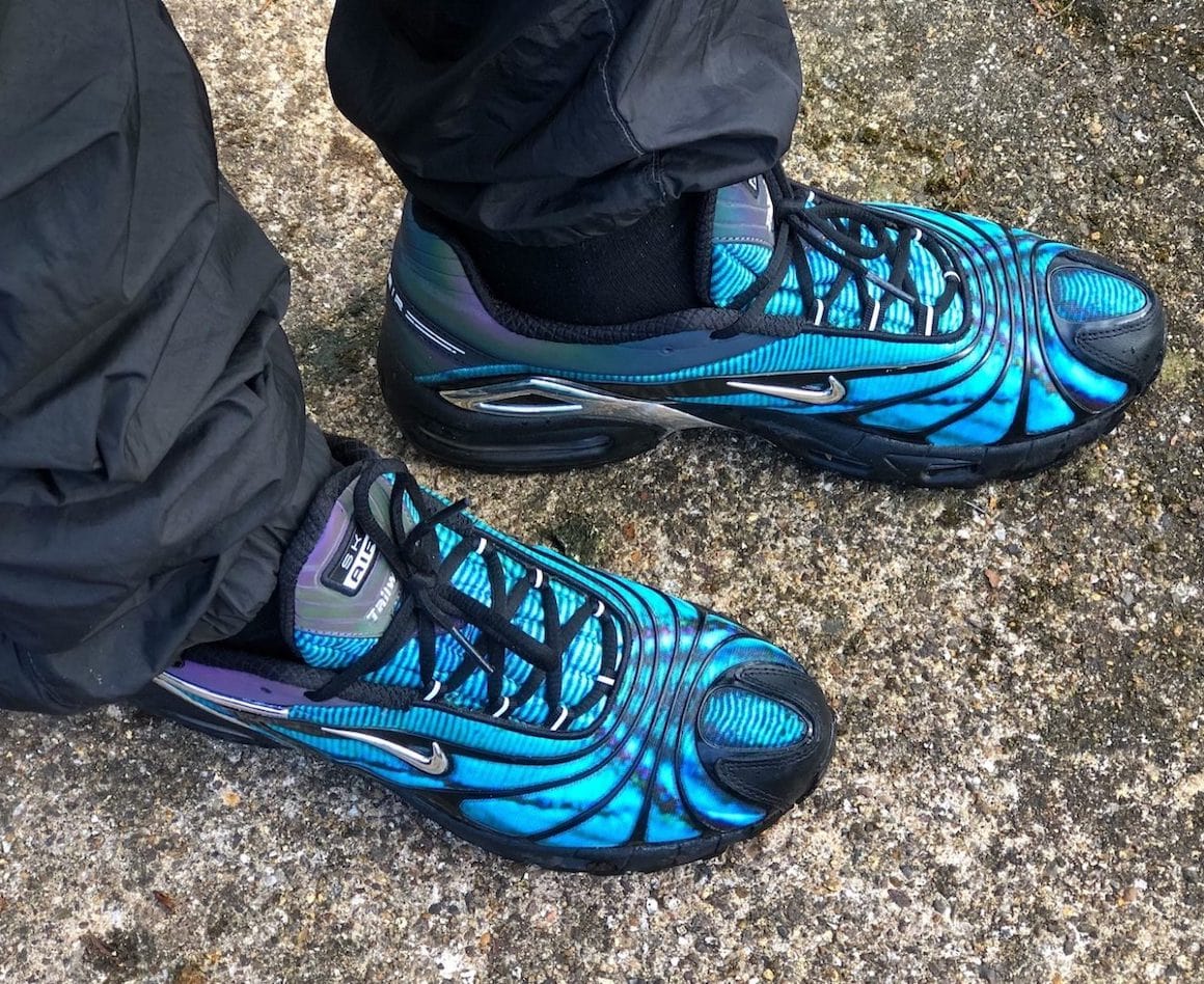 Posiblemente la zapatilla Skepta x Nike más colorida que hemos visto hasta ahora, la Nike Air Max Tailwind V Sk Air es ciertamente audaz. Con un patrón azul brillante de tie-dye en la parte superior, el zapato está cubierto por las clásicas superposiciones TPU en negro neutro. Otros detalles notables incluyen una lengua iridiscente, con la marca “Sk Air”, y acentos cromados en el Swoosh y la entresuela. Las plantillas personalizadas también incluyen el logotipo de los raperos británicos Nike, un elemento sutil que nos encanta. Sentados encima de una suela ennegrecida, estos tienen el potencial de ser uno de los zapatos del verano.