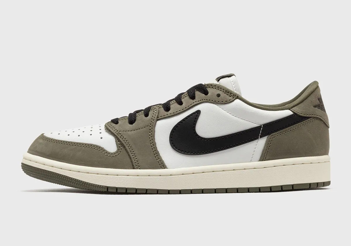 The ‘Medium Olive’ features premium olive green suede overlays paired with a smooth sail white leather upper, creating a timeless, neutral look that works with any outfit. Black Swooshes provide sharp contrast across the side panels, while a black Jordan Wings logo stamped on the heel adds a refined OG finish.