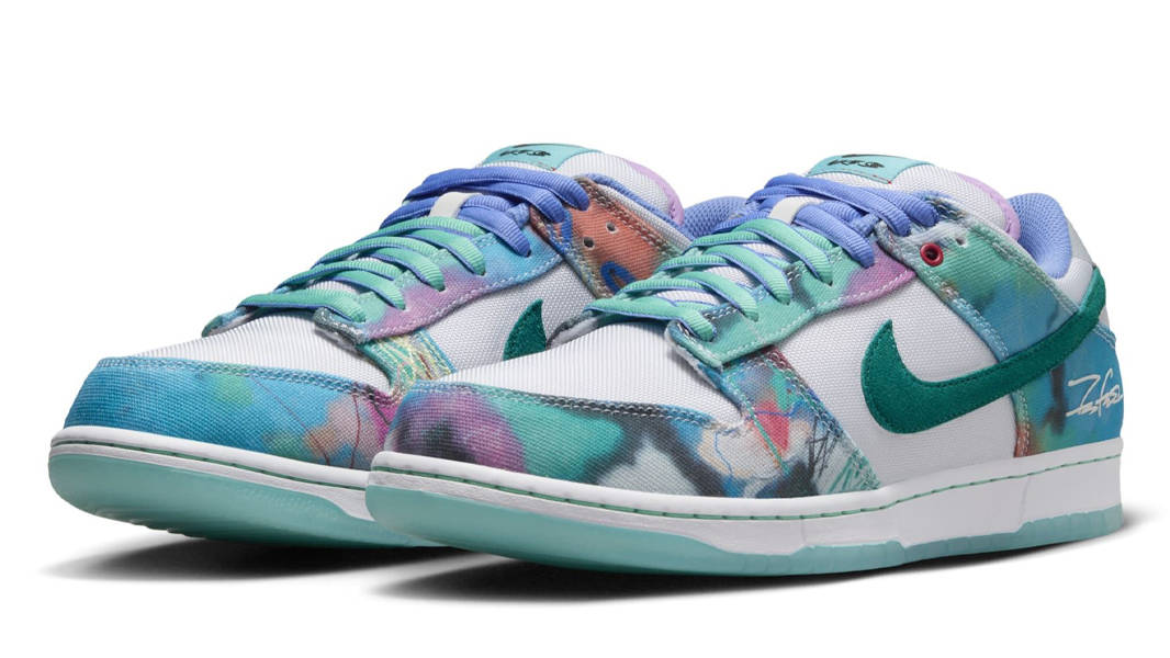 The Nike SB x Futura Laboratories Dunk Lows come in a white canvas upper, with abstract artwork covering its ‘Aqua Teal’ overlays. These graphics are inspired by Futura’s untitled abstract artworks from 1984. Futura’s signature is written in 3M on the heel and appears on the translucent blue rubber outsole.