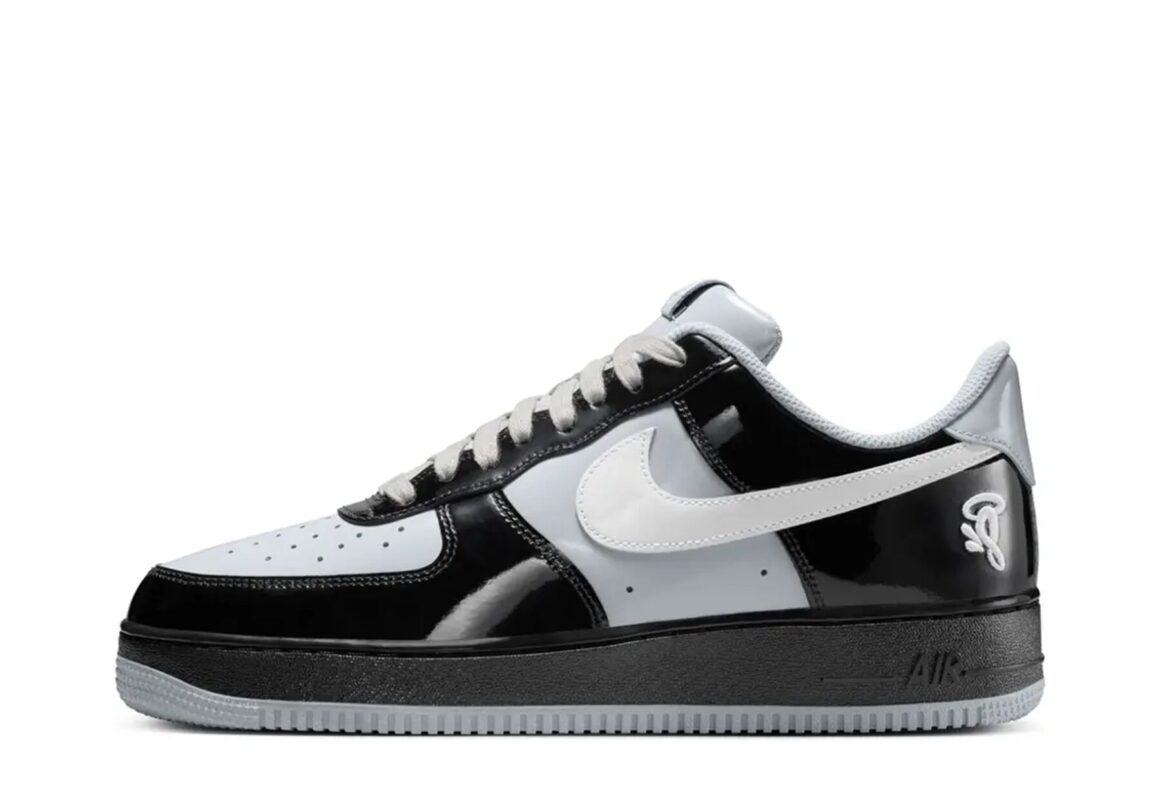 UK rapper Central Cee’s clothing brand Syna World launches its first Nike collab with this Air Force 1, rendered in a clean ‘Black Smoke Grey’ patent leather upper.