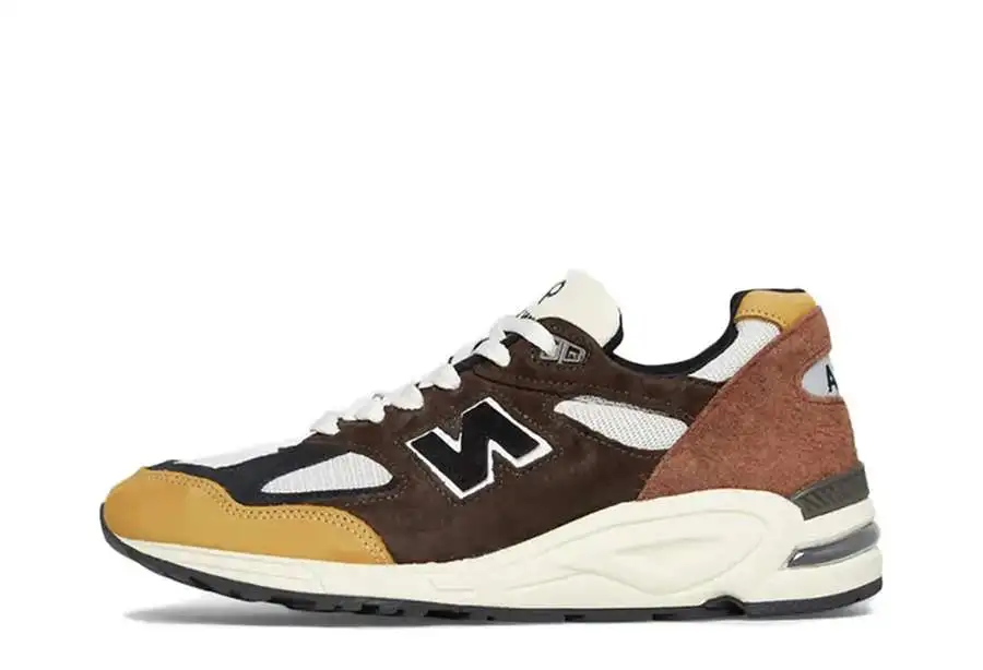 Following up the v3, the 990v2 comes in an earthy array of brown suede overlays, with a mustard yellow toe cap and a crisp white mesh base.