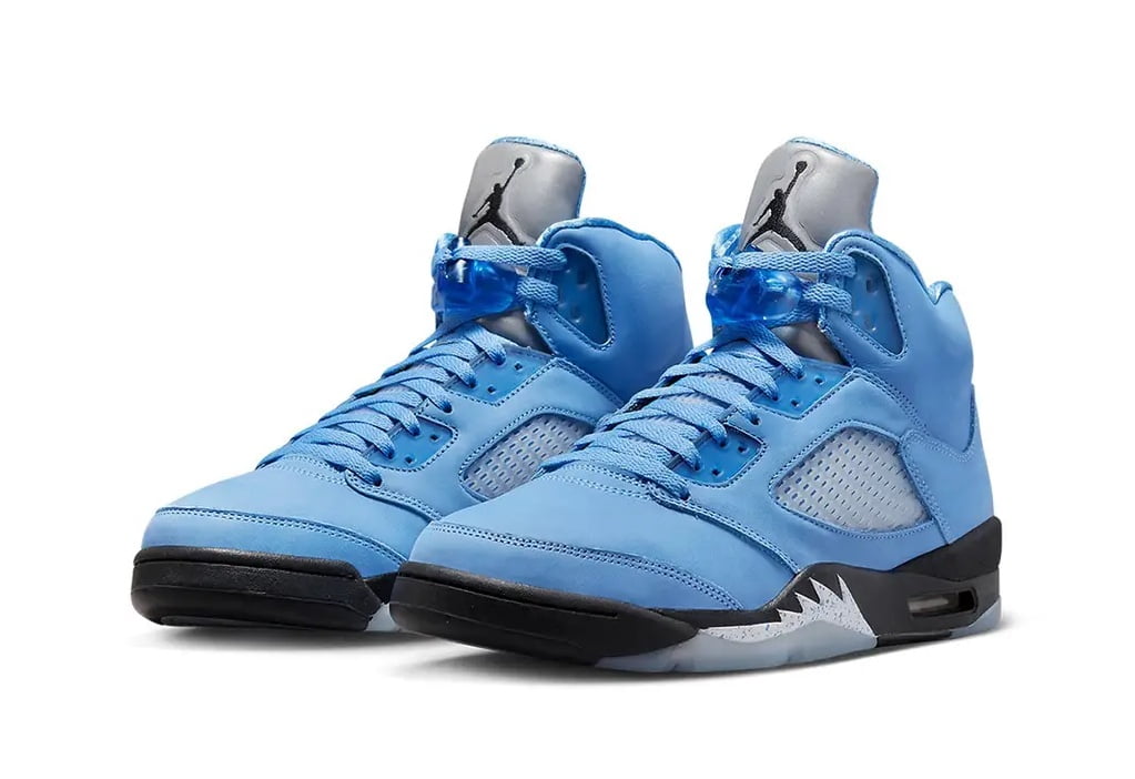 These Air Jordan 5s come in the iconic North Carolina baby blues, with glistening silver teeth on its Air midsole.