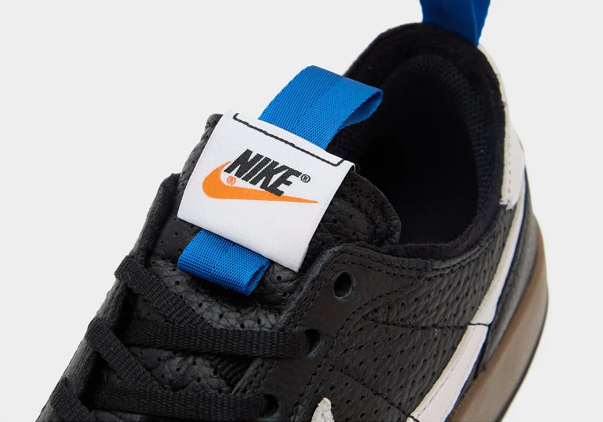 Replacing the tightly woven mesh and suede overlays of the previous colourways, this pair is made with tumbled black leather with perforations running throughout. The Swooshes on these sides stand out in white leather, with hits of royal blue on the fabric pull tabs found on the tongue and heel. The thick midsole comes in brown, with a black rubber outsole featuring Nike’s patent waffle iron pattern.